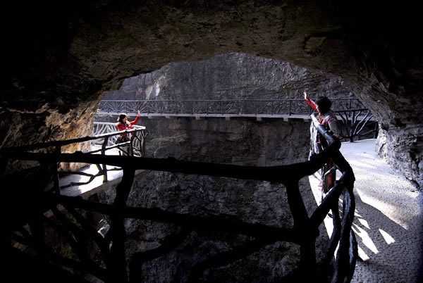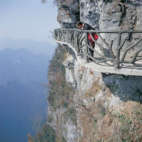 據(jù)施工人員介紹,此條棧道也是他們所修棧道中施工最難,最險峻的一條。如果您還覺得不夠刺激的話,在棧道的完結(jié)處的兩個懸崖之間有一條長160米的懸索吊橋,同時,在海拔最高點還有一個挑戰(zhàn)心里極限的玻璃站臺,在這里,如果你能挺直腰板伸開雙臂,那么,您就是真正的勇士了。