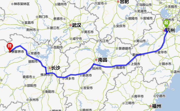余杭去張家界自駕車自助游線路圖全程高速):