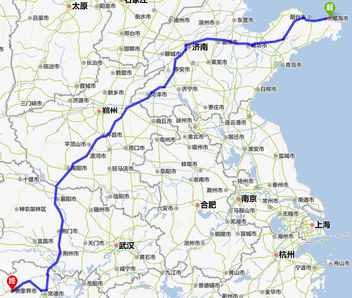 威海去張家界自駕車(chē)自助游線路圖全程高速):