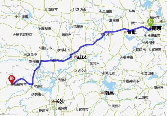 左右,沿途經過南京——合肥——六安市——麻城市——仙桃市——潛江市——荊州市——常德市(這里可以不走常德,直接從荊州經澧縣、石門縣到慈利縣)——慈利縣——張家界。