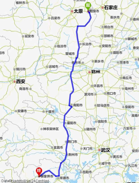 左右,沿途經過陽泉——長治——焦作——南陽——襄陽——荊門——荊州——常德(也可以走國道經澧縣、石門縣)——慈利——張家界。